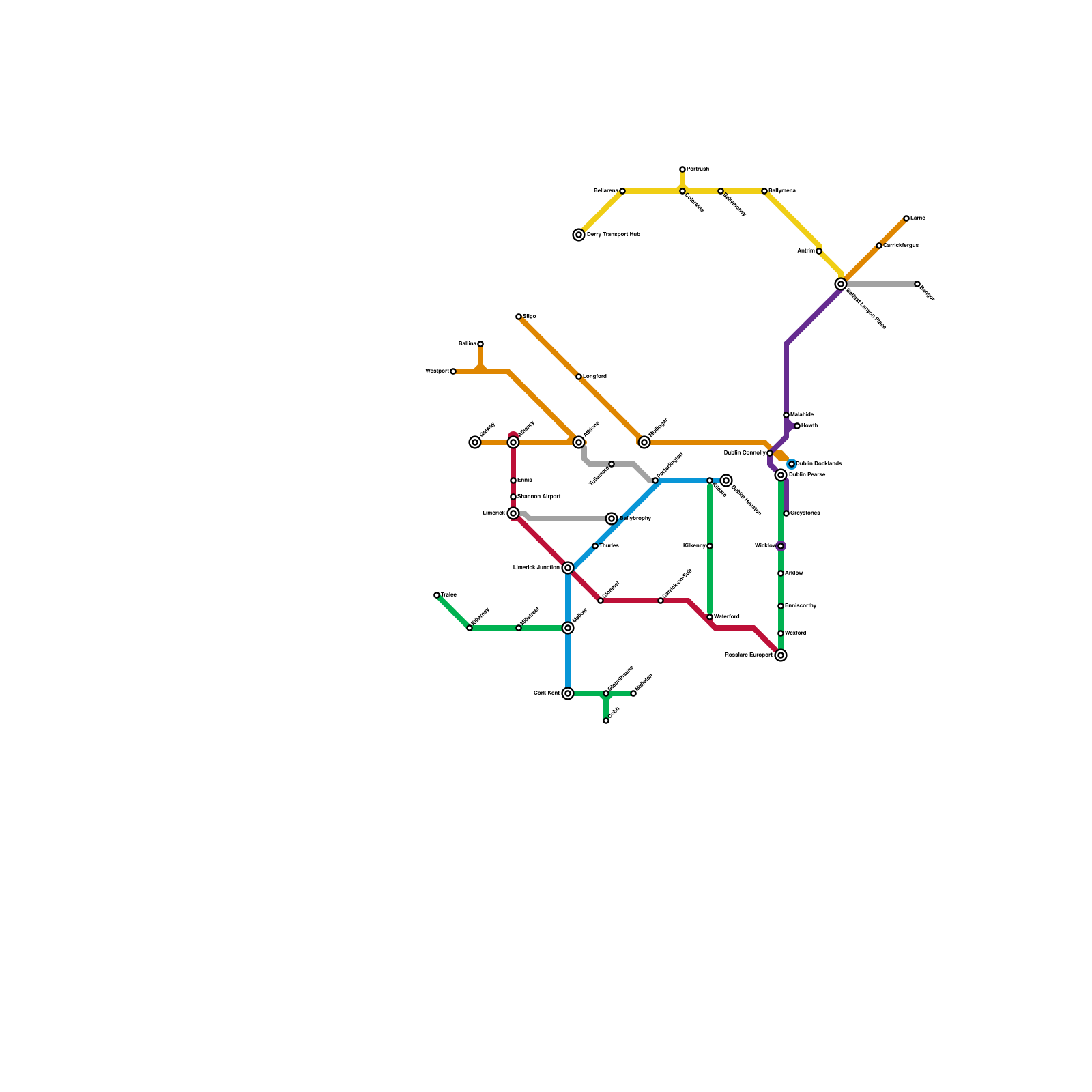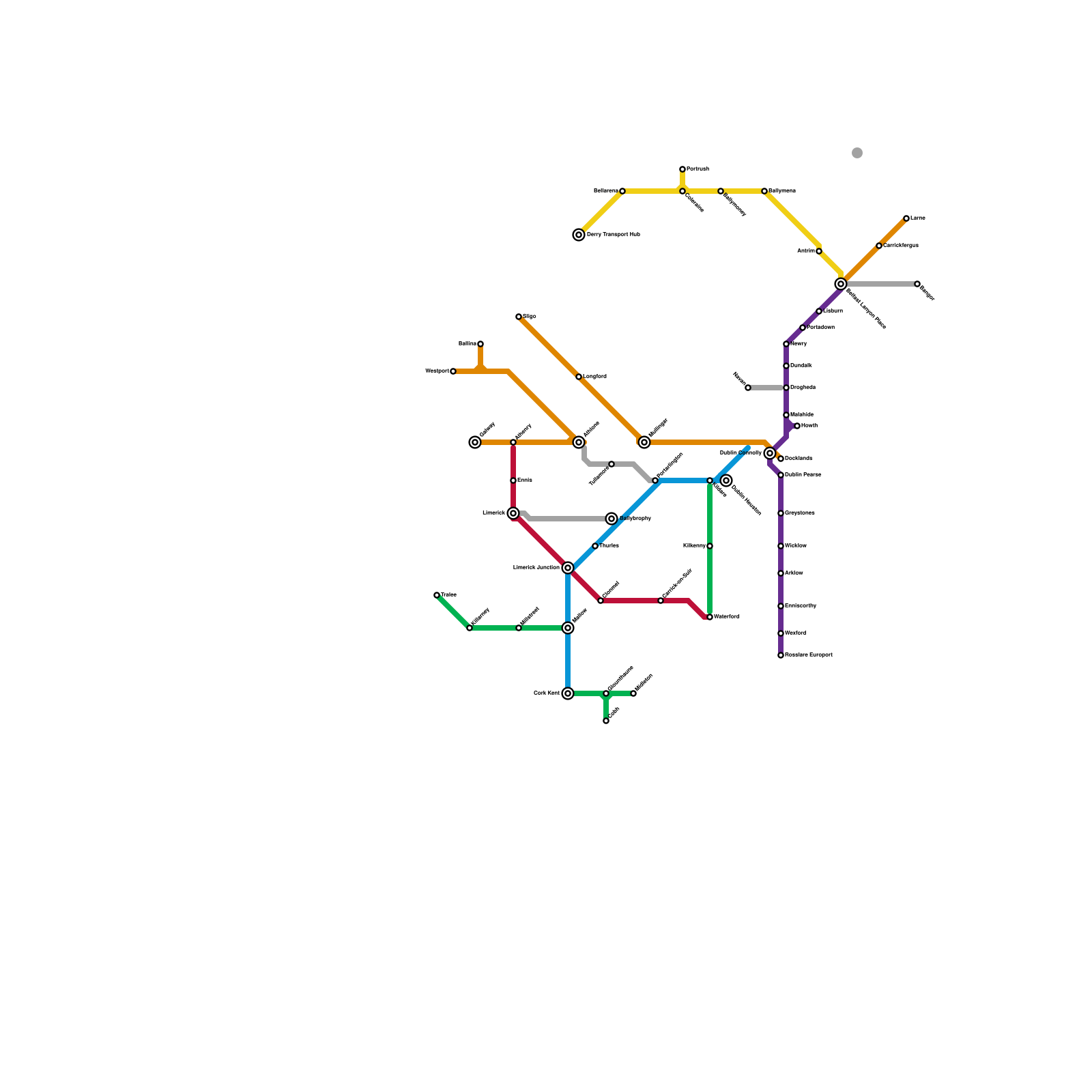 Current Irish Railway passenger network (real)