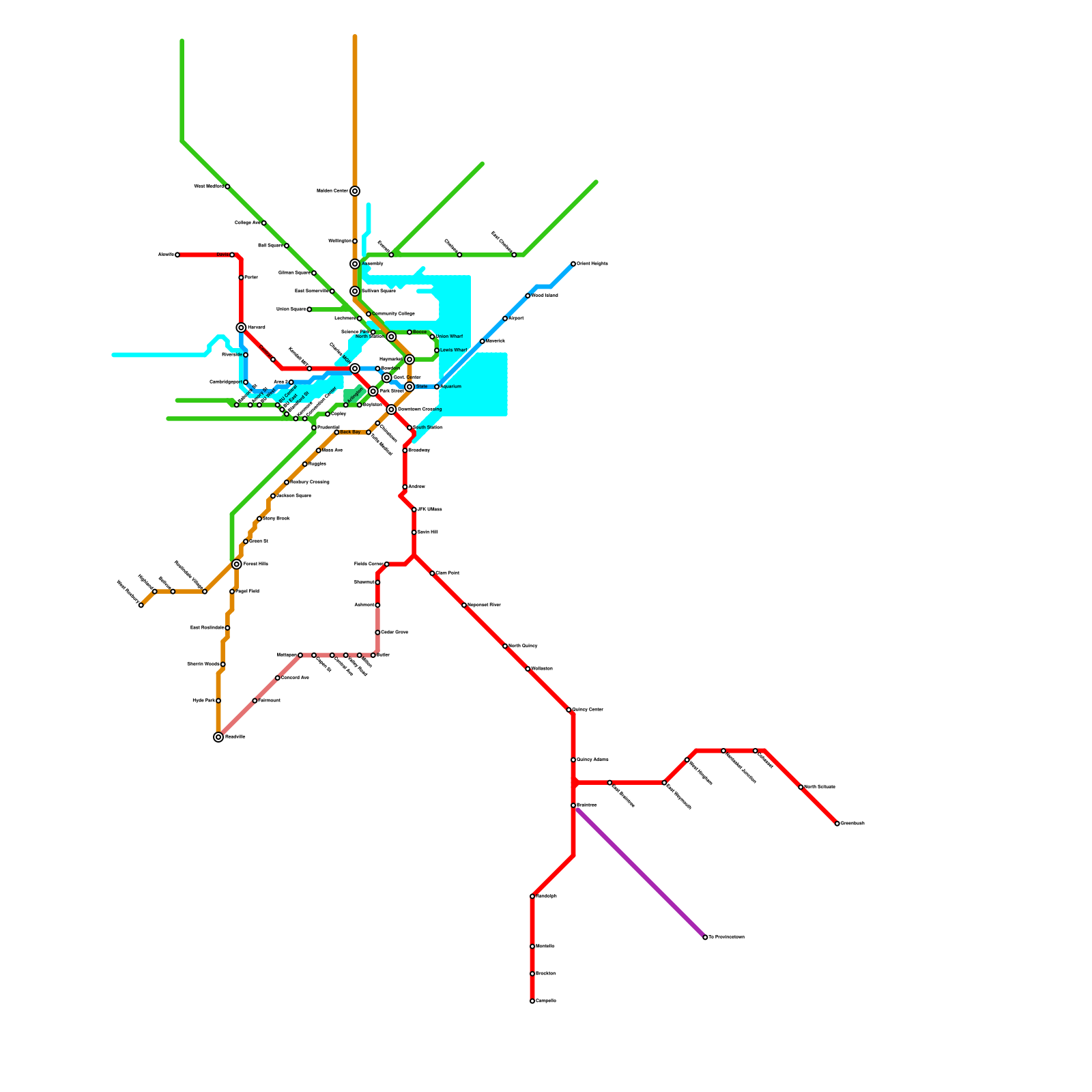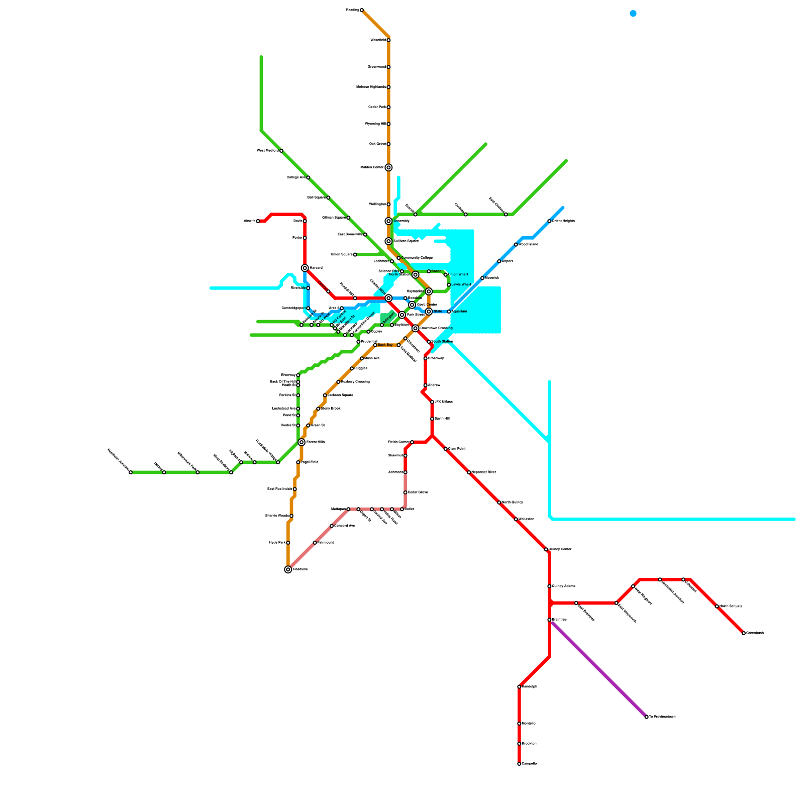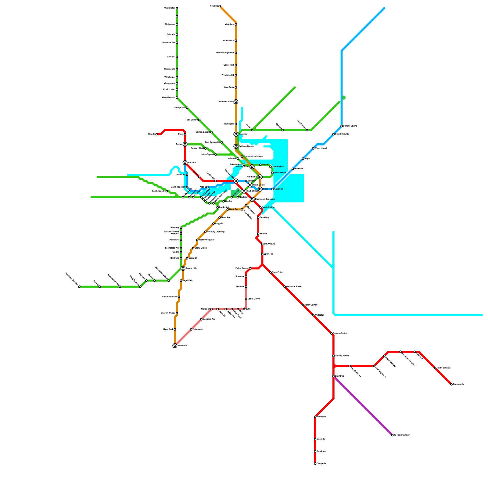 This is a map of the MBTA system with several extensions and new lines. (speculative)